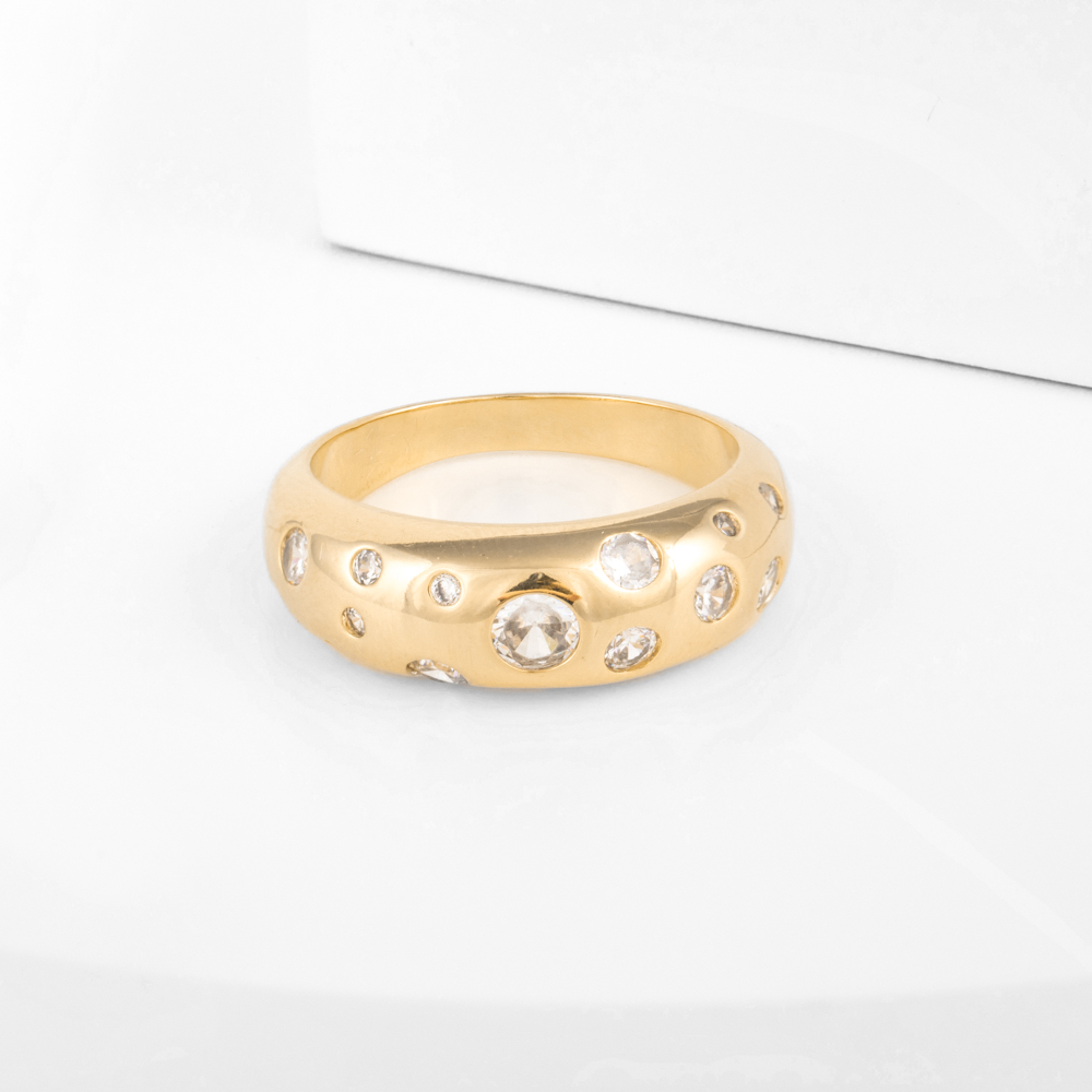 Apresentamos o anel abaulado perfeito para qualquer ocasião! Com zircônias incolores e banho de ouro 18k, ele combina elegância e versatilidade.