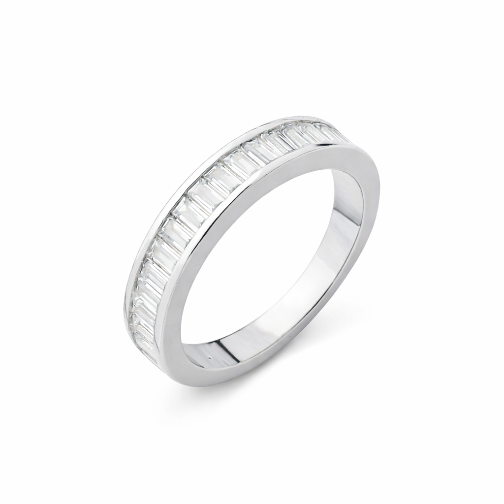 O Anel Baguettes Incolor Banho de Ródio Branco é a definição de sofisticação moderna. Com fileira de pedras baguette incolor cravejadas com precisão, ele traz brilho intenso, acabamento refinado e um design elegante que valoriza qualquer produção, do look básico ao mais sofisticado.