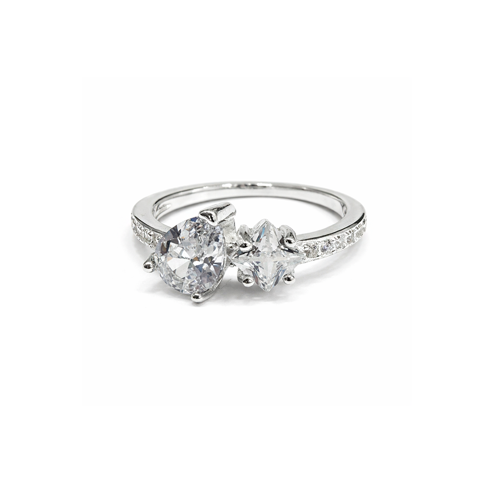Este anel em Prata 925 é a definição de elegância contemporânea. Seu design moderno apresenta duas zircônias centrais em formatos distintos, cuidadosamente cravadas para criar um contraste harmonioso entre formas e brilho. O resultado é uma joia marcante, sofisticada e cheia de personalidade.