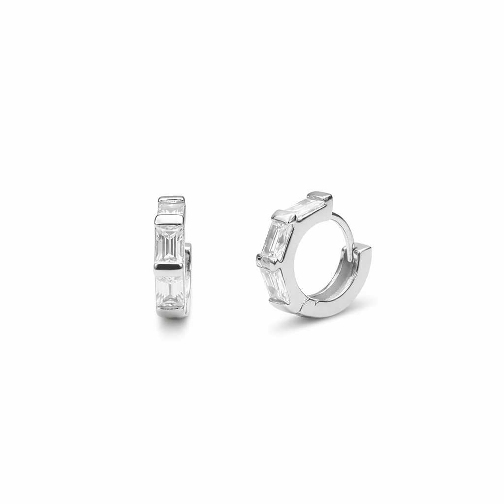 A argola com zircônias em corte baguette traz um brilho elegante na medida certa. As linhas de zircônias incolores aplicadas na parte frontal criam um efeito sofisticado e discreto, ideal para quem gosta de acessórios versáteis que combinam com tudo.