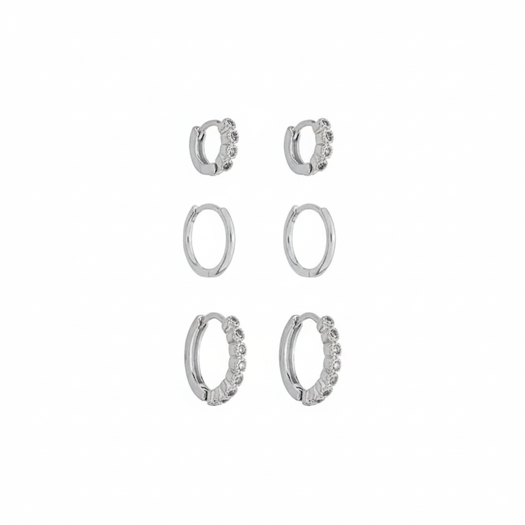 O modelo menor e o maior recebem aplicação de zircônias cravejadas que garantem um toque sofisticado e iluminado, enquanto a argola lisa complementa o trio com equilíbrio e minimalismo
