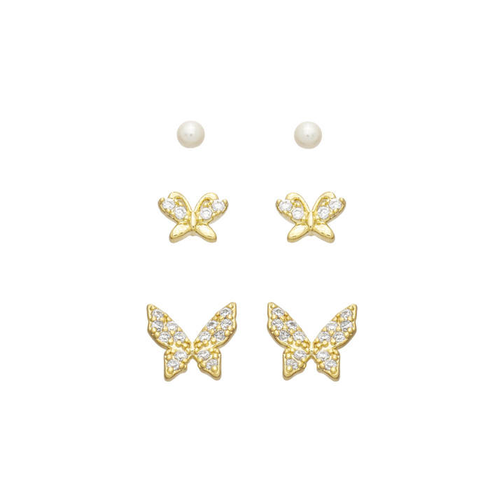 Com design feminino e atemporal, o conjunto traz três modelos encantadores: um par de pérolas clássicas, um par de borboletas pequenas com zircônias e um par de borboletas maiores, também cravejadas, que garantem um toque de brilho e sofisticação. Perfeito para compor mix de brincos ou usar individualmente.