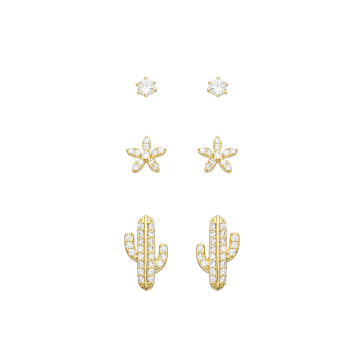 Charmoso, moderno e superversátil, o Trio de Brincos Cacto, Flor e Ponto de Luz é a escolha ideal para quem ama peças delicadas com um toque de brilho.