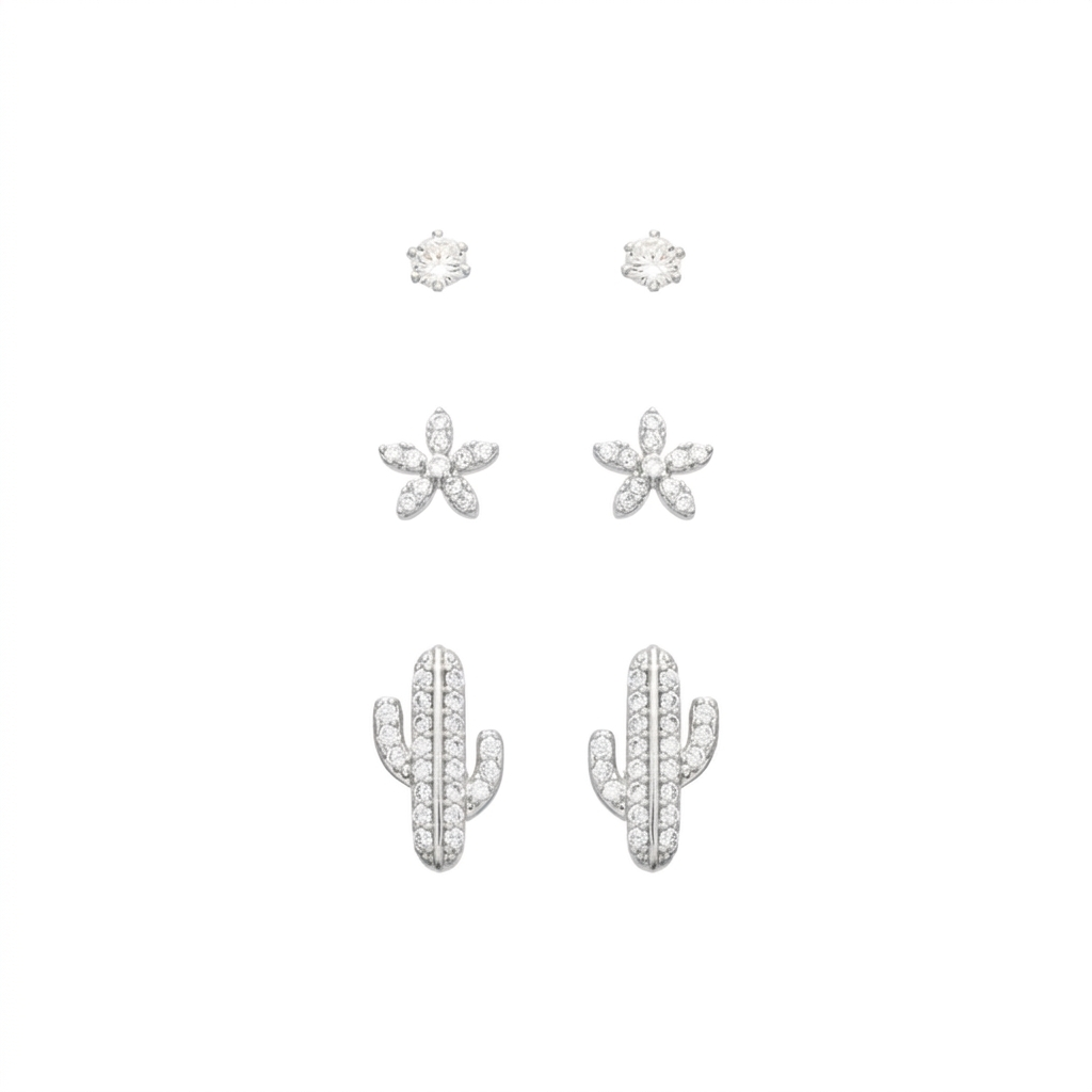 Charmoso, moderno e superversátil, o Trio de Brincos Cacto, Flor e Ponto de Luz é a escolha ideal para quem ama peças delicadas com um toque de brilho.
