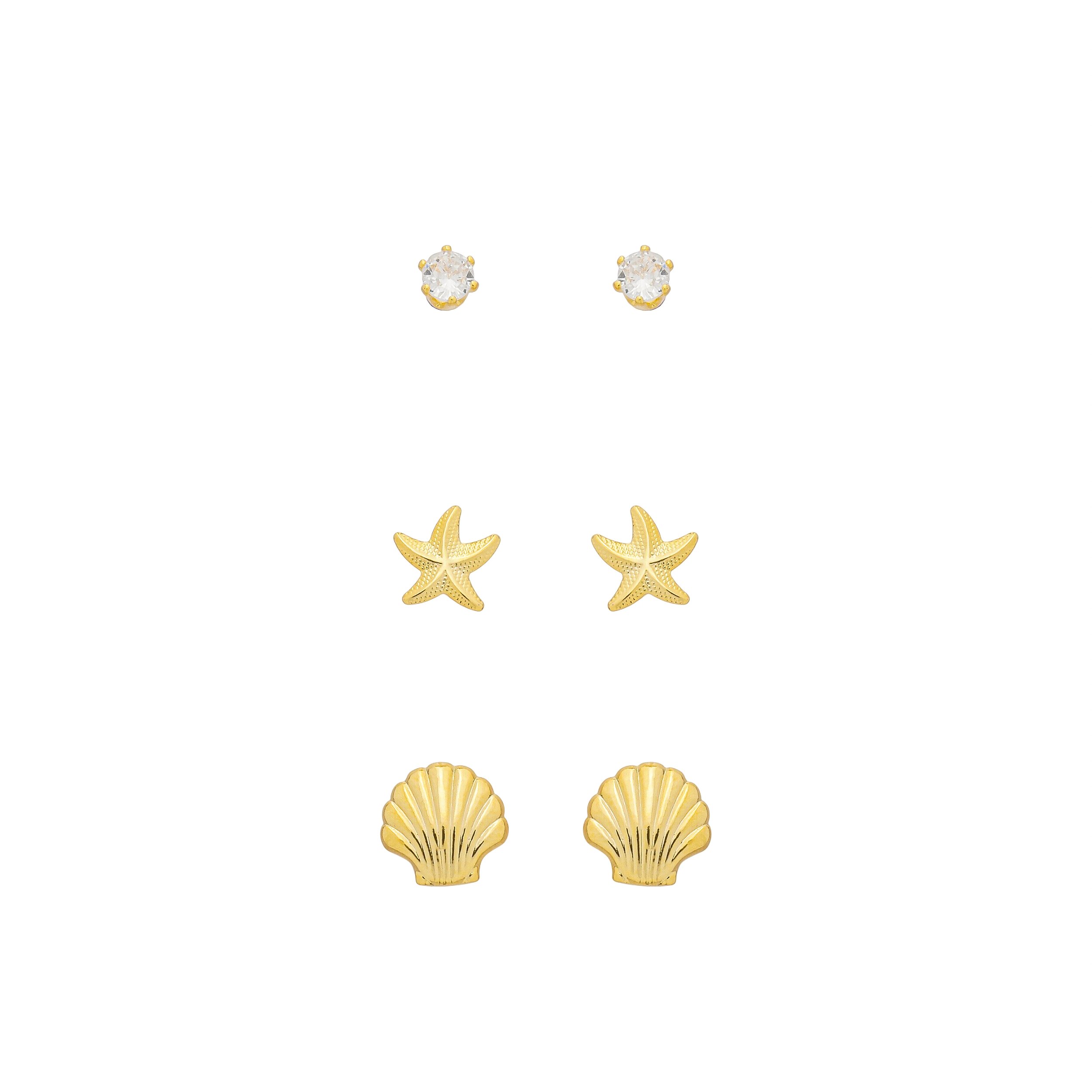 Esse delicado trio de brincos traz três modelos encantadores: ponto de luz com zircônia, estrela-do-mar texturizada e concha. Um conjunto versátil que permite criar combinações modernas ou usar cada peça separadamente, adicionando charme e brilho ao visual.