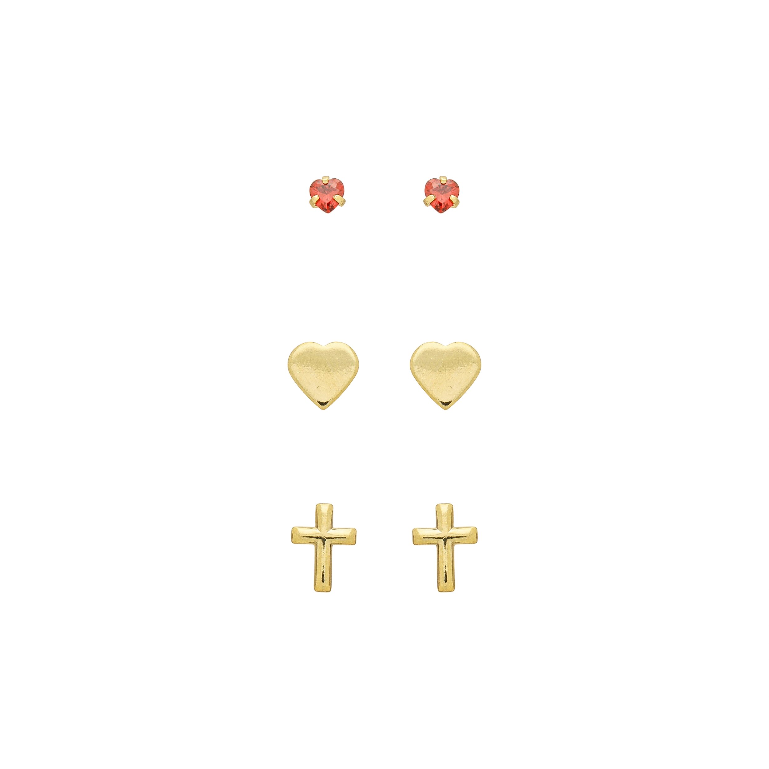 O Basiquinhos: Trio Coração, Cruz e Ponto de Luz Rubi Banho de Ouro 18k traz três modelos essenciais para quem ama versatilidade e leveza no dia a dia. Com banho de ouro 18k, o conjunto inclui um delicado ponto de luz rubi, um par de corações minimalistas e um par de cruzes clássicas. São peças atemporais, perfeitas para usar sozinhas ou em combinações no segundo e terceiro furo.