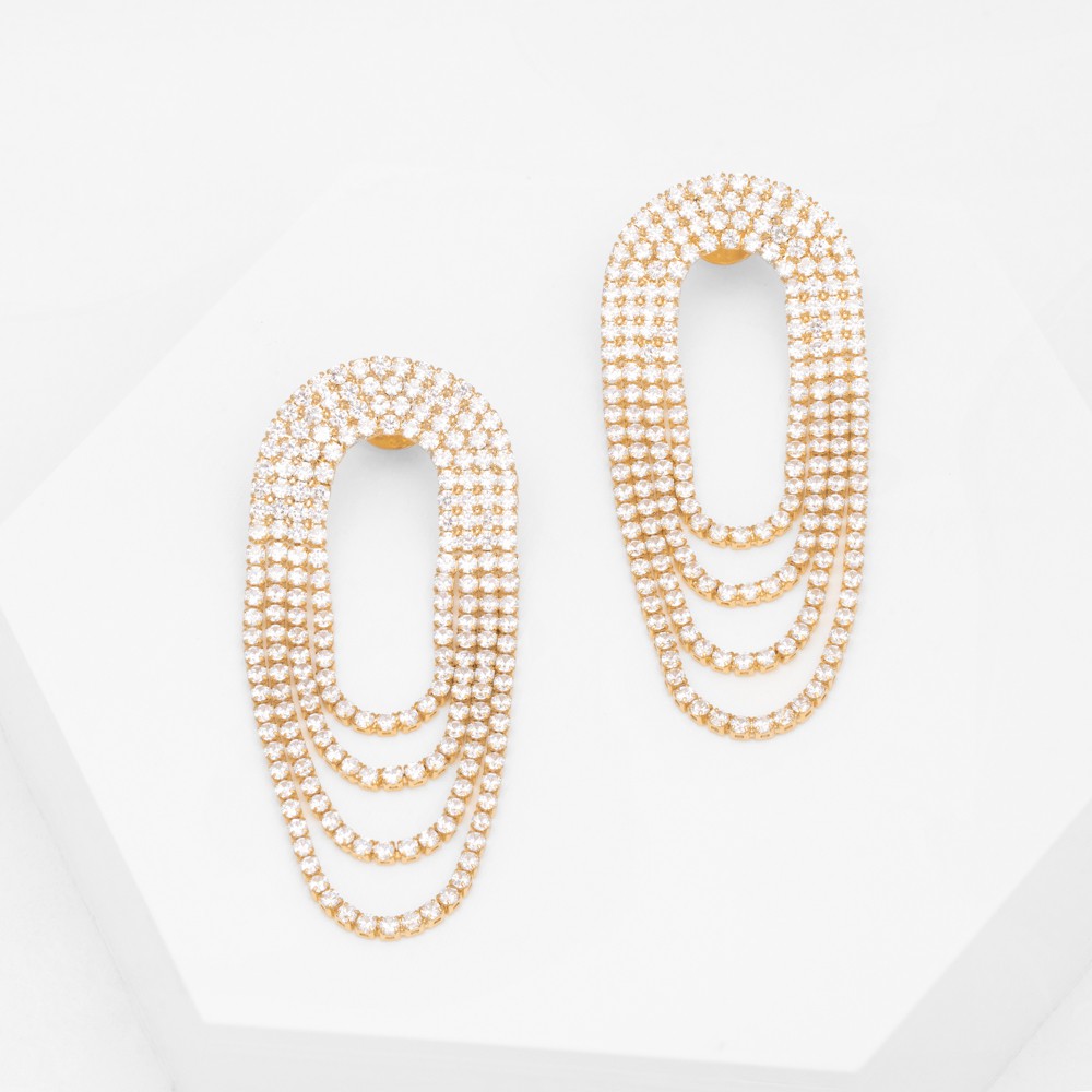 O brinco é longo composto por formato de arco e correntes, cravejado de zircônias incolor e banhado a ouro 18k.
