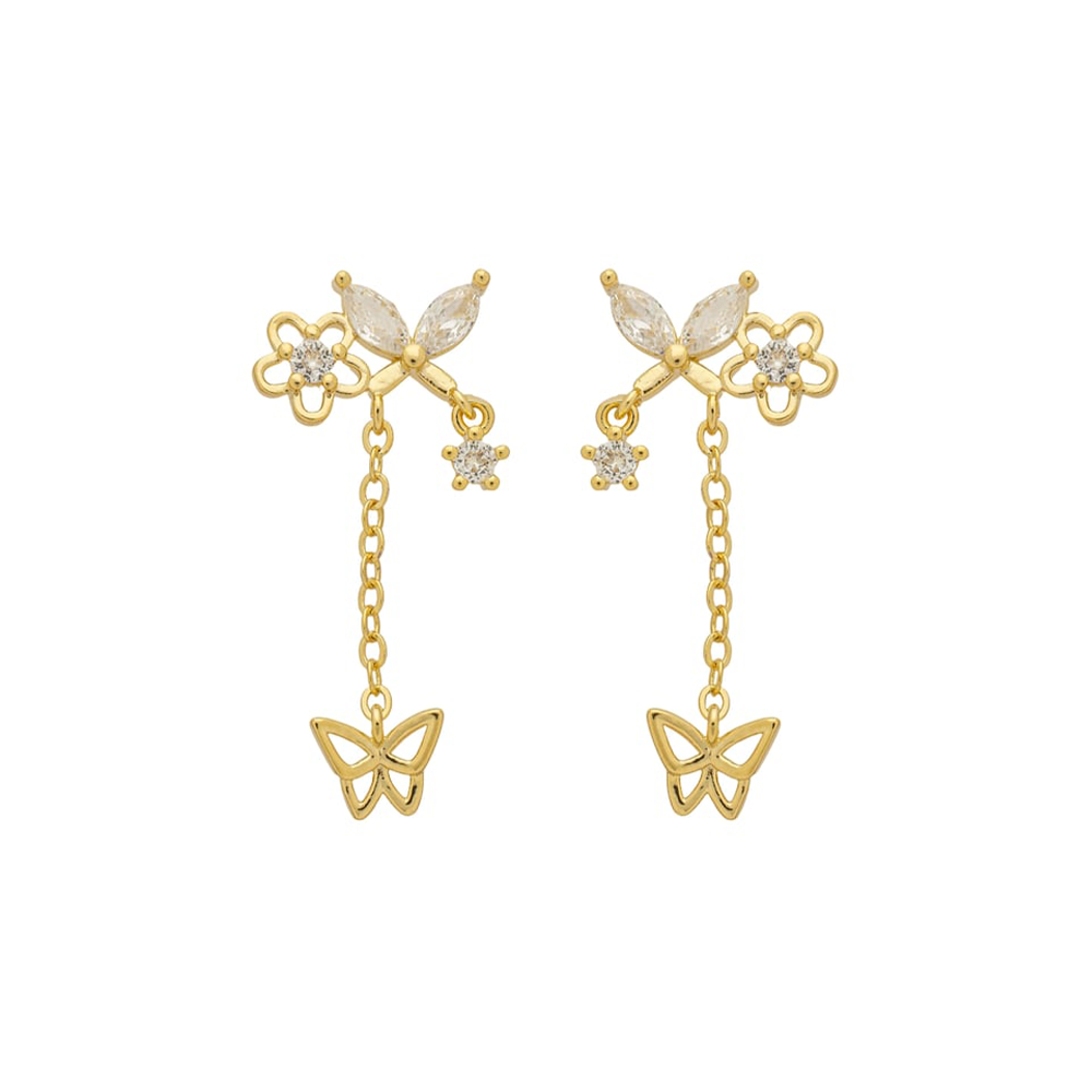 Brinco Borboleta com Flor e Zircônias Incolores Banho de Ouro 18k