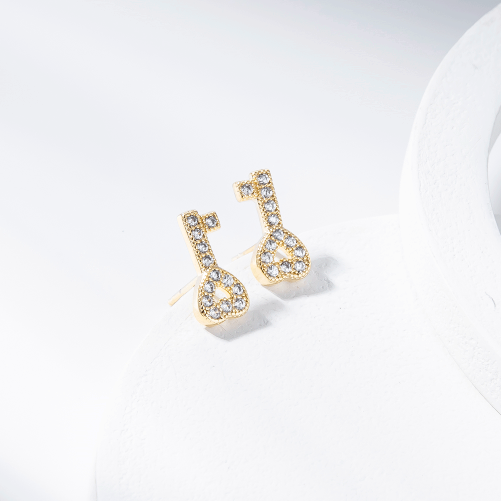 Brinco em formato de chave, cravejado com zircônias incolores. Design delicado, com brilho sutil, perfeito para complementar o visual.