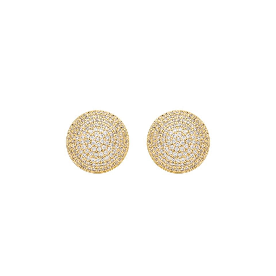 Luxo e delicadeza em perfeita harmonia, este par de brincos são pura sofisticação. O design em formato de cúpula é completamente cravejado com micro zircônias brilhantes, que refletem a luz de maneira deslumbrante a cada movimento. O contraste entre o dourado e o brilho cristalino cria um efeito elegante e atemporal, ideal para quem ama peças que chamam atenção pela sutileza e pelo refinamento.