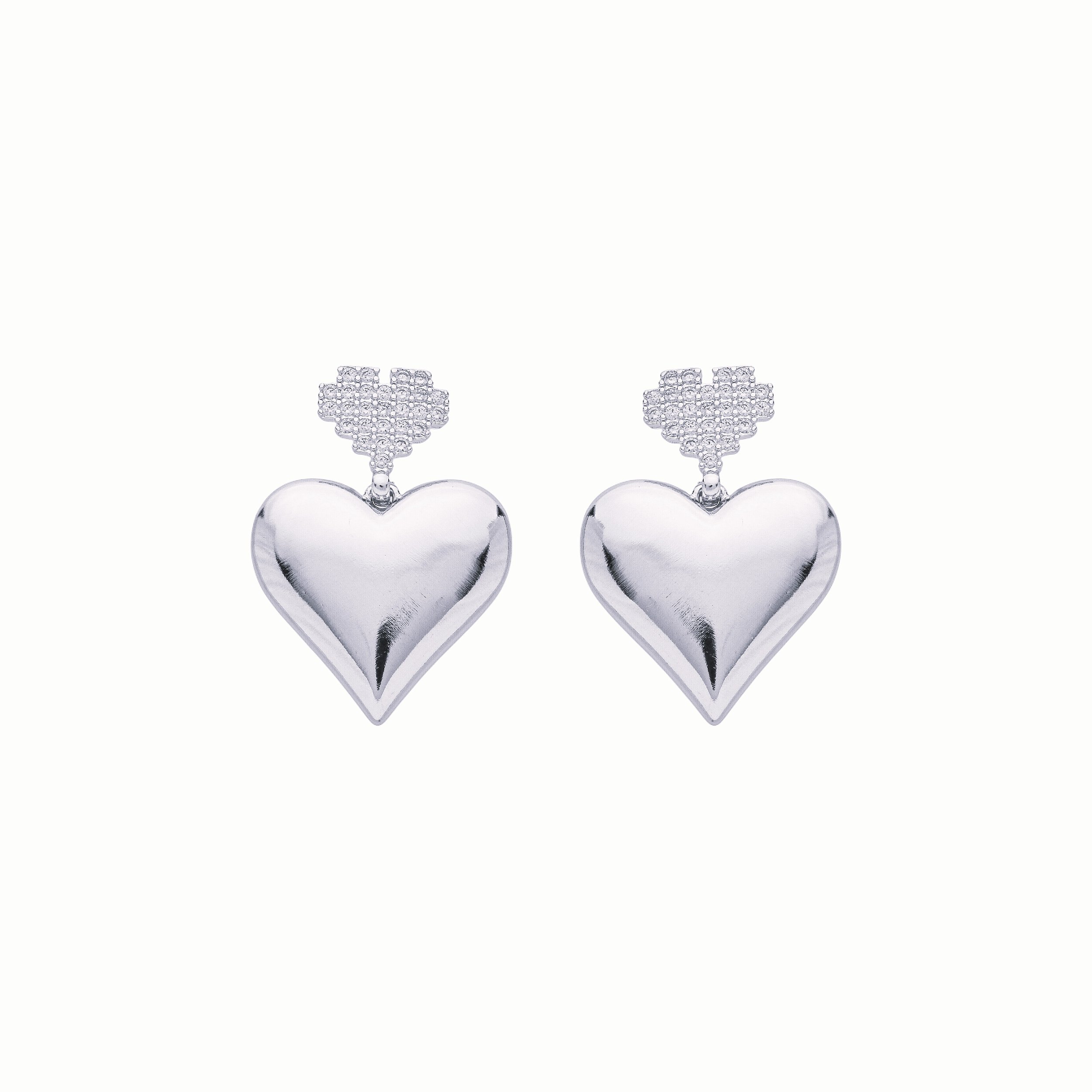 Brinco Coração Duplo Zircônias Incolor Banho de Ródio Branco
