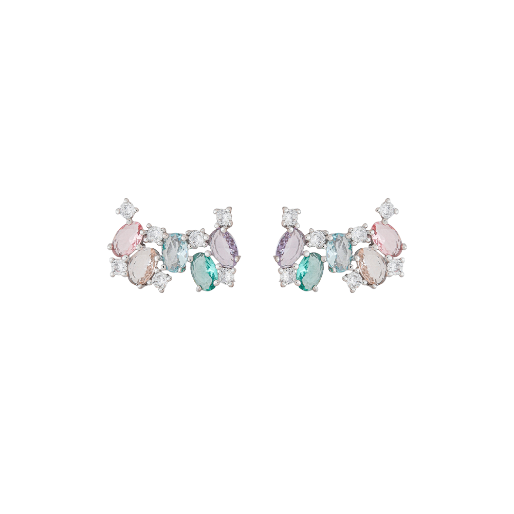 O acabamento prateado realça ainda mais as cores das pedras e adiciona um toque de luxo à peça, enquanto as zircônias brancas cravejadas complementam o brilho com elegância. Um brinco delicado, mas marcante, perfeito para quem ama joias diferentes e cheias de charme.