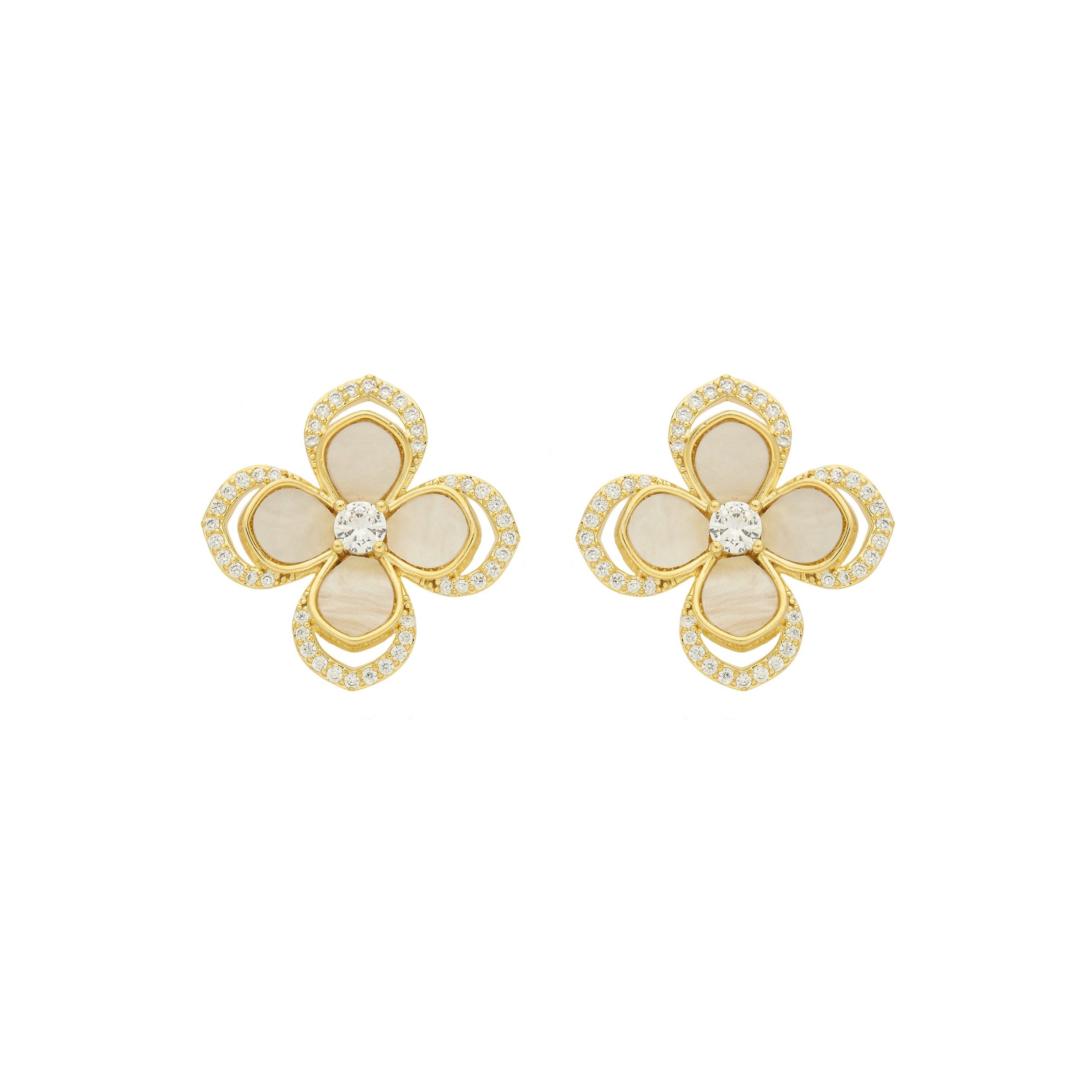 Brinco em formato de flor com detalhes em madrepérola, que trazem um brilho suave e natural à peça. O contorno é realçado por zircônias incolores cravejadas, que iluminam o design e valorizam ainda mais o acabamento. No centro, uma zircônia destaca-se de forma harmoniosa, completando o visual com equilíbrio e beleza.