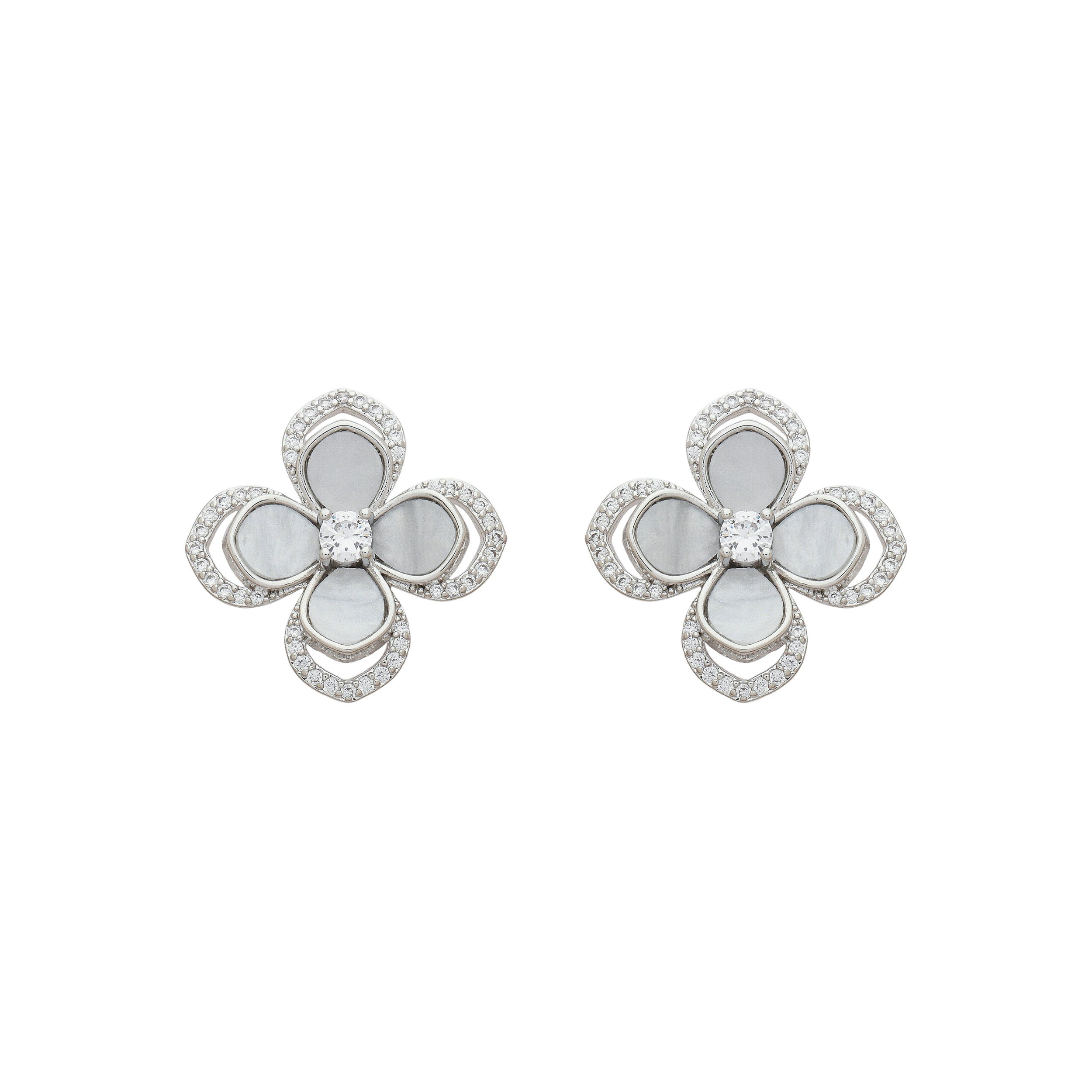 Brinco em formato de flor com detalhes em madrepérola, que trazem um brilho suave e natural à peça. O contorno é realçado por zircônias incolores cravejadas, que iluminam o design e valorizam ainda mais o acabamento. No centro, uma zircônia destaca-se de forma harmoniosa, completando o visual com equilíbrio e beleza.