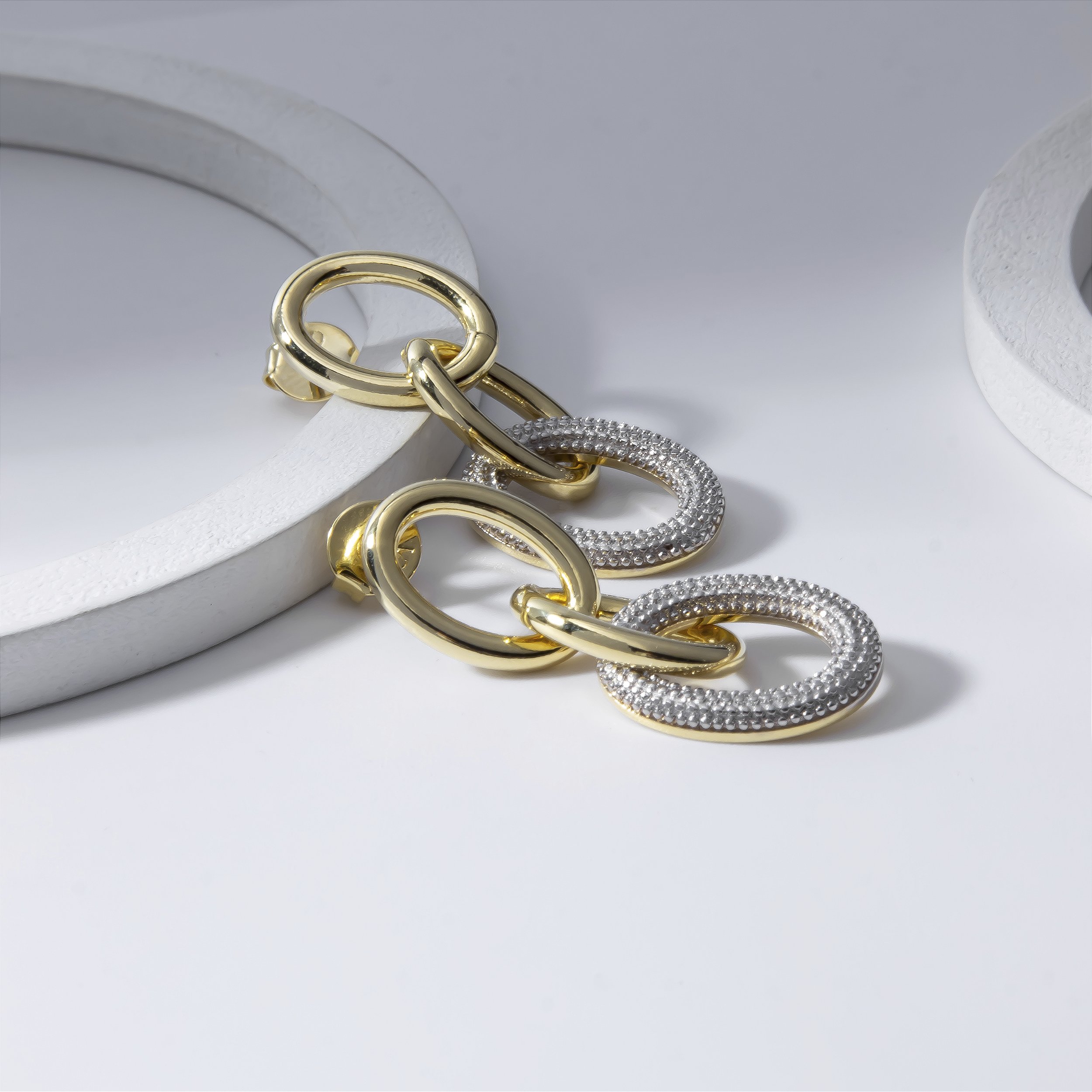 Brinco composto por 3 elos interligados sendo um deles com detalhes em zircônias incolor.