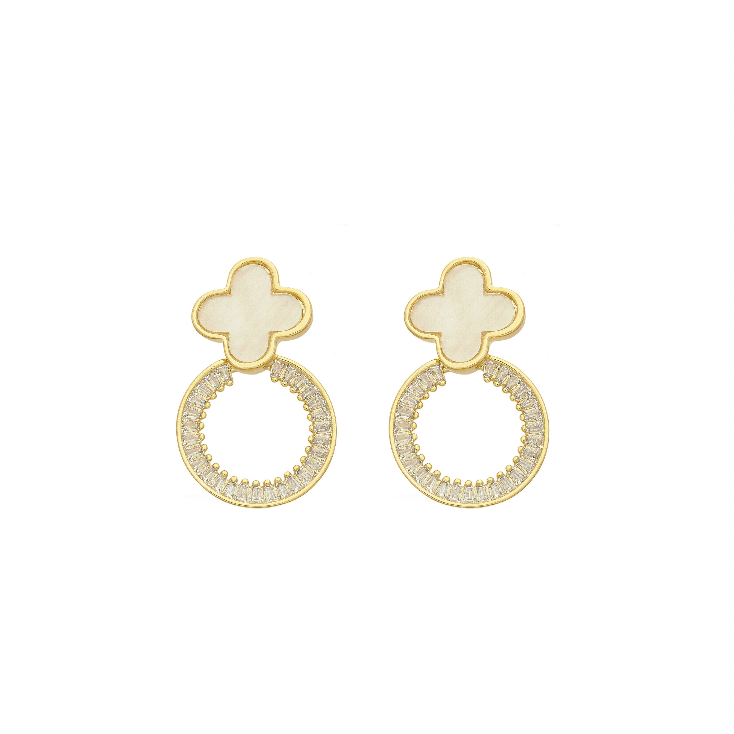 Brinco Trevo em Madrepérola e Detalhe Baguettes Circular em Banho de Ouro 18K