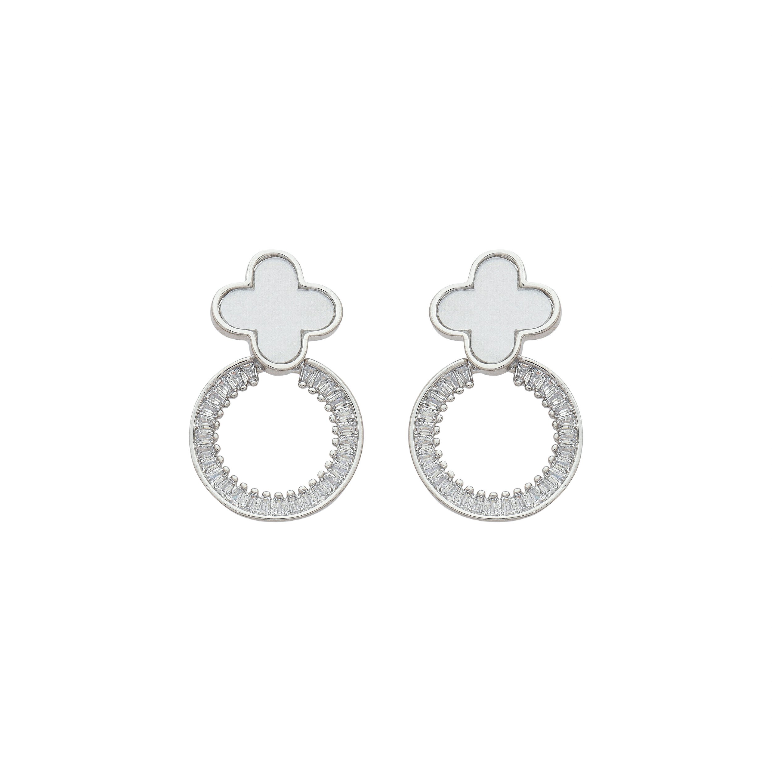 Brinco Trevo em Madrepérola e Detalhe Baguettes Circular em Banho de Ródio