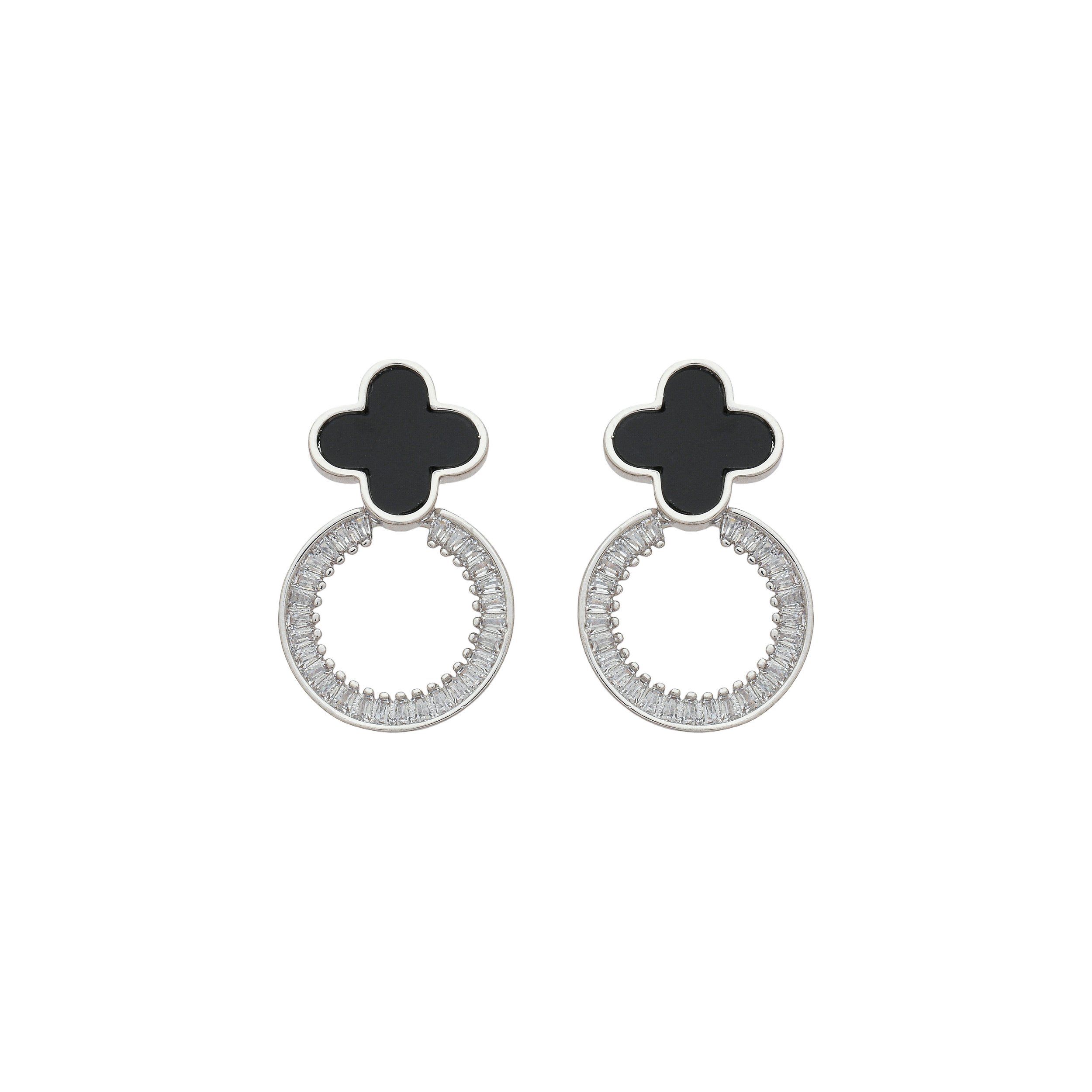 Brinco Trevo Esmaltado Preto e Detalhe Baguettes Circular em Banho de Ródio
