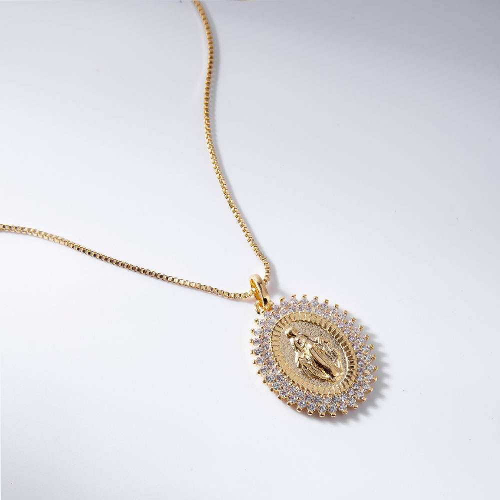 Colar composto por corrente veneziana e pingente de Nossa Senhora das Graças comentorno cravejdas de zircônias. Peça delicada e sofisticada, perfeita para quem busca um acessório que combine espiritualidade e elegância. O pingente de Nossa Senhora das Graças é uma representação clássica e repleto de significado na fé cristã.