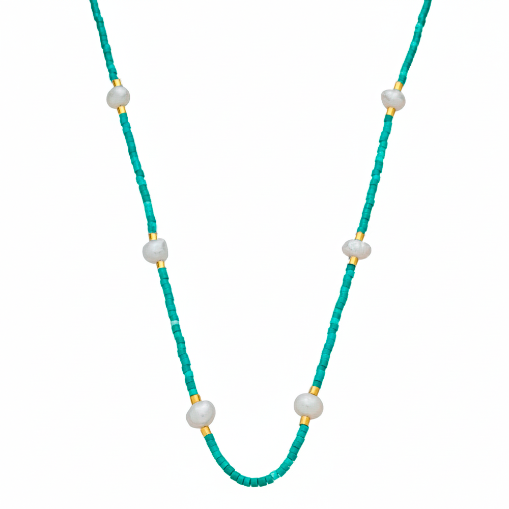 O Colar Pérolas Água Doce & Mini Canutilhos Turquesa é uma peça delicada e cheia de charme, perfeita para quem ama a união entre o clássico e o moderno. As pérolas naturais trazem elegância e luminosidade, enquanto os mini canutilhos turquesa adicionam um toque fresh, leve e super atual — uma combinação que transmite tranquilidade, proteção e estilo.
