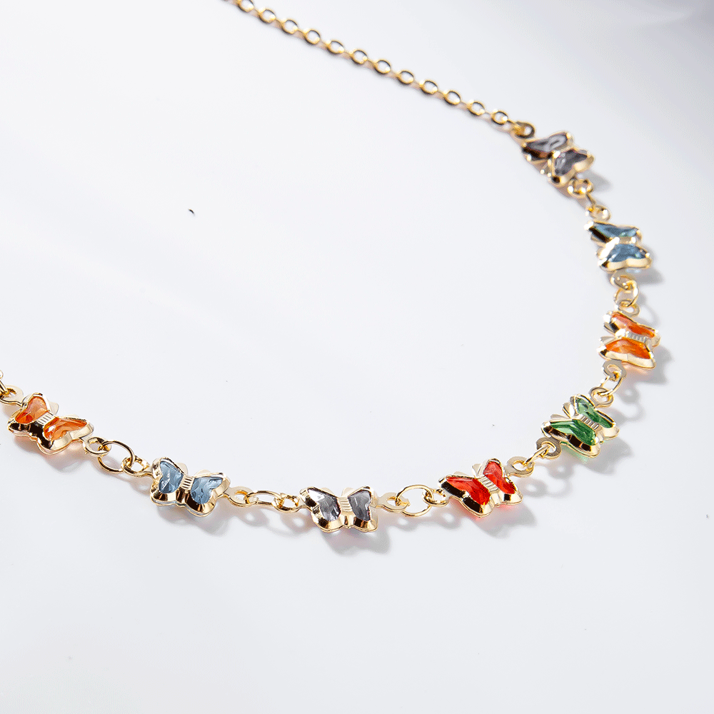 O Colar Infantil Borboletas Coloridas conta com 8 Borboletas e possui banho de ouro 18k, sendo perfeito para iluminar os momentos especiais das pequenas.