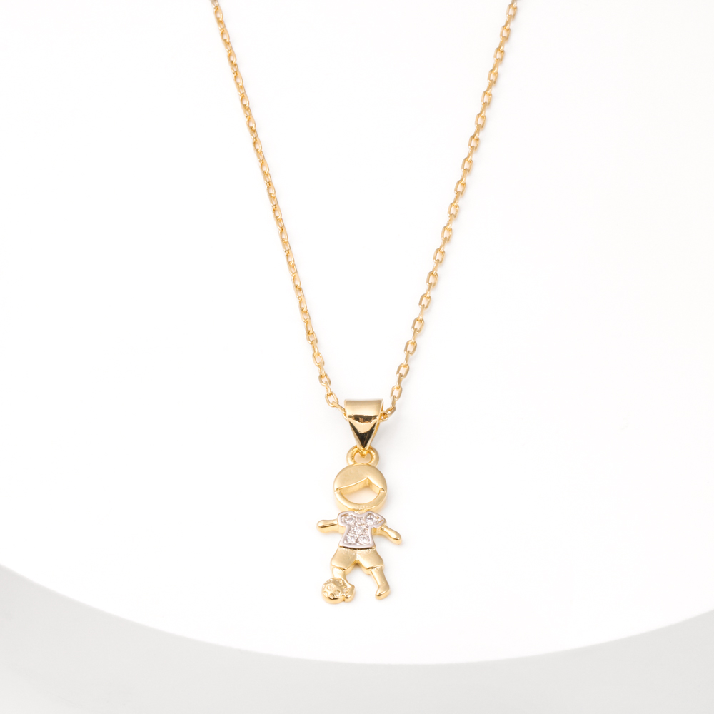Colar composto por um menino jogador de futebol, zircônias incolor e banho de ouro 18k.