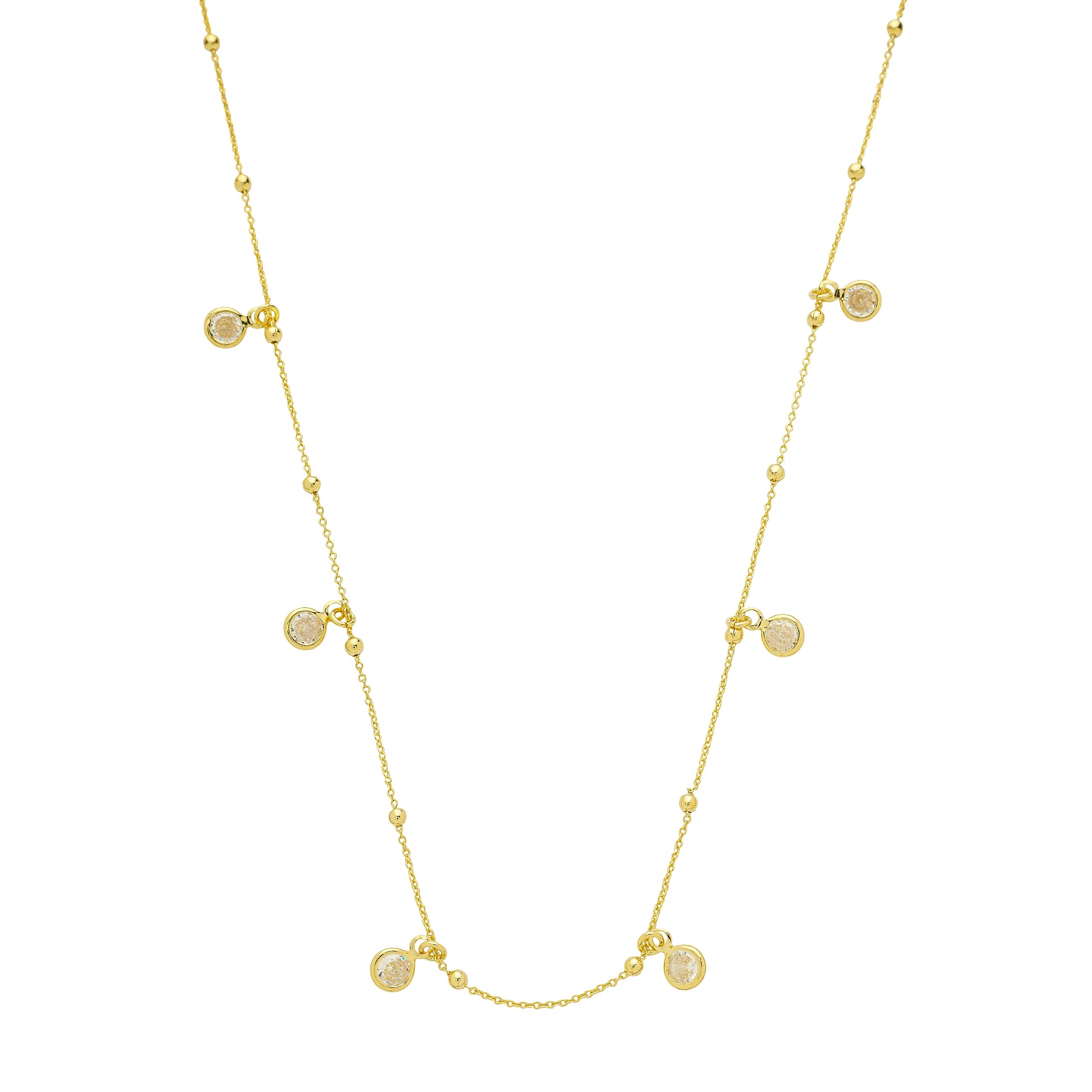 Leve e cheio de charme, esse colar dourado é composto por uma corrente delicada adornada com pequenos pingentes de zircônia que iluminam o visual com brilho sutil. O design equilibrado cria movimento e elegância, tornando a peça perfeita para quem aprecia acessórios femininos, versáteis e atemporais. Ideal para usar sozinho ou em composições delicadas.