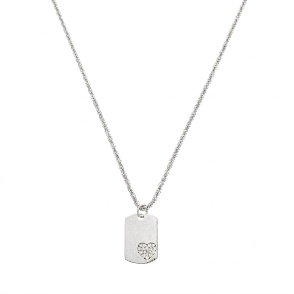 Delicado e cheio de significado, o colar com placa retangular e detalhe de coração em zircônias é a escolha perfeita para quem ama joias com toque romântico e moderno. A placa lisa recebe um coração cravejado que traz brilho na medida certa, criando um contraste sofisticado e encantador.