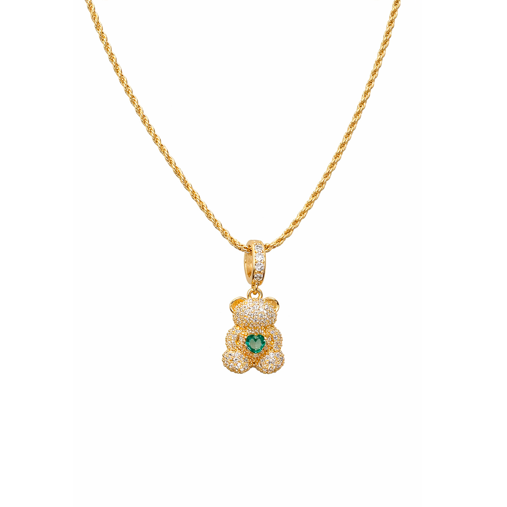 O destaque fica por conta do pingente de ursinho, cravejado com zircônias brancas que proporcionam um brilho sofisticado, e com um delicado coração verde central, símbolo de amor, proteção e ternura. Uma peça charmosa que transmite leveza e personalidade ao visual.