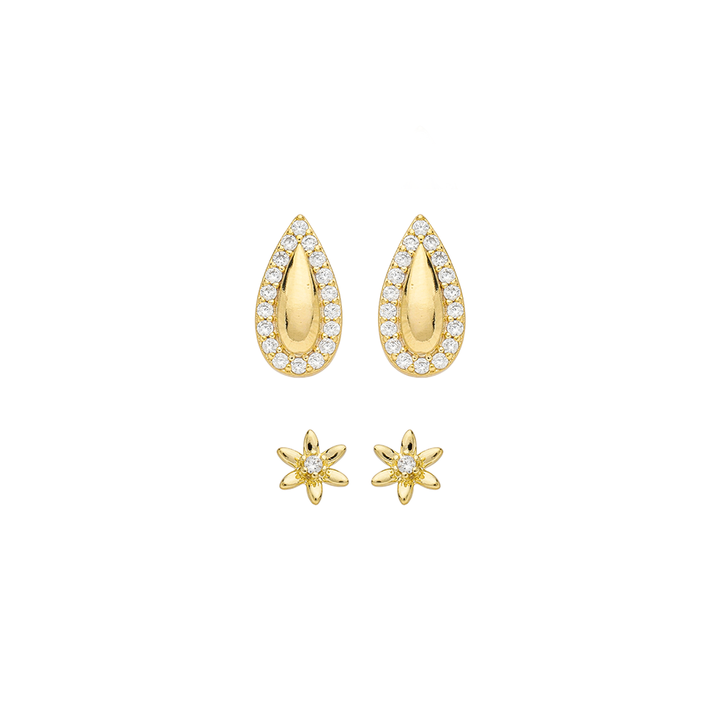 Duo Gota Entorno Cravejado e Mini Flor Zircônias Incolor Banho de Ouro 18K