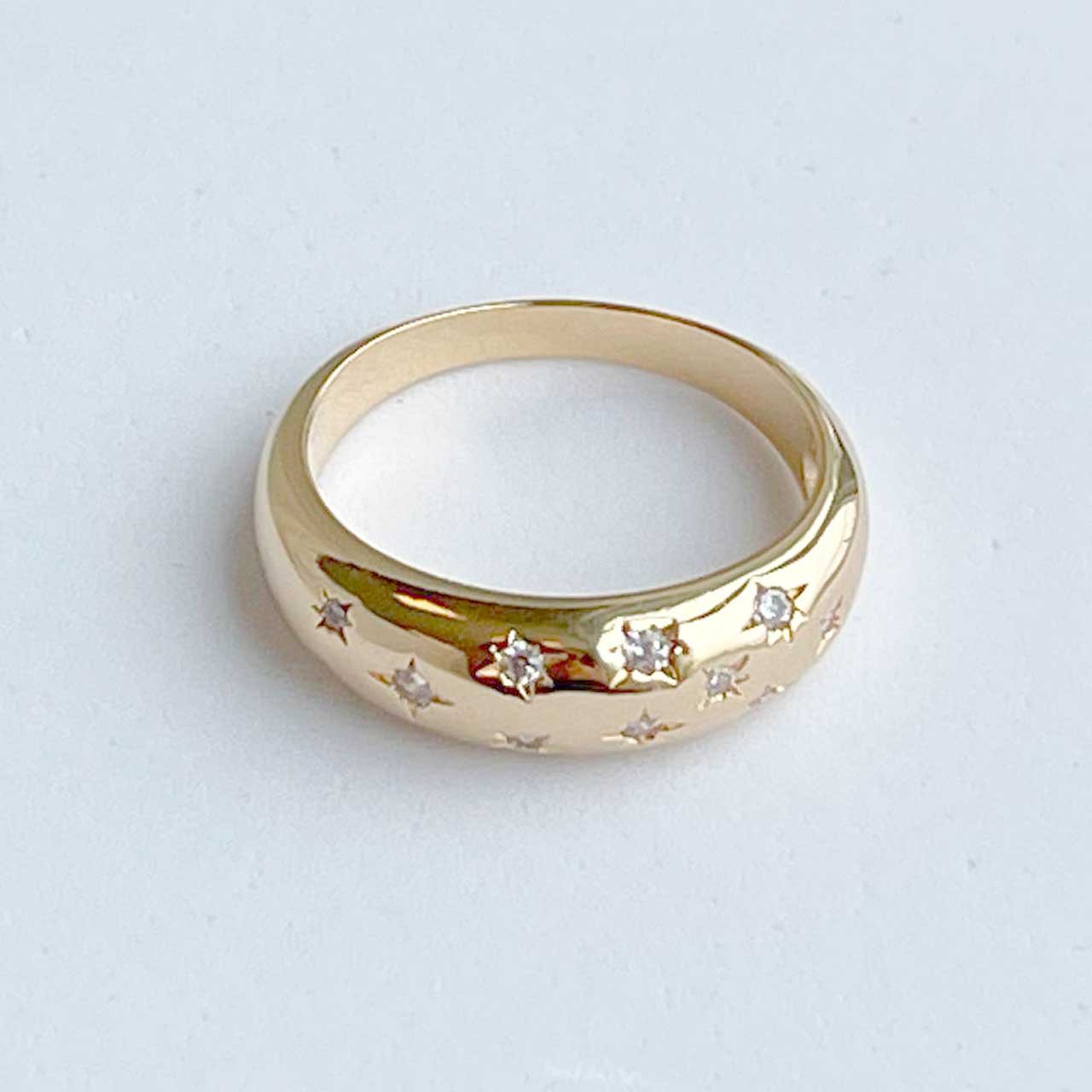 O anel é composto por design abaulado e estrelas cravejadas de zircônias incolor, banhado a ouro 18k.