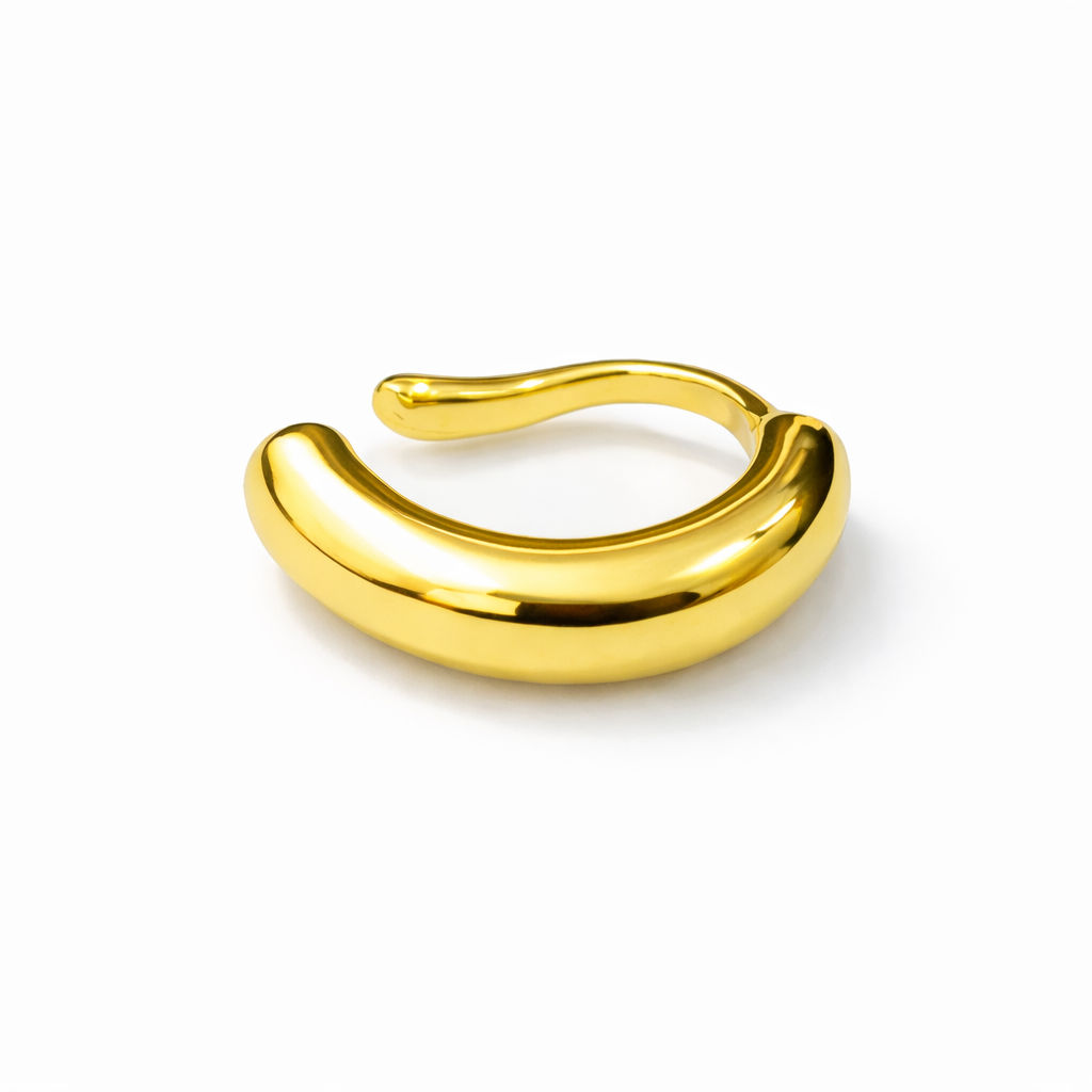 Piercing com acabamento dourado e design liso, que envolve a orelha de forma confortável e segura, sem necessidade de furo. Seu formato curvo e superfície polida garantem um visual sofisticado e versátil, ideal para quem busca um acessório marcante e fácil de usar.
