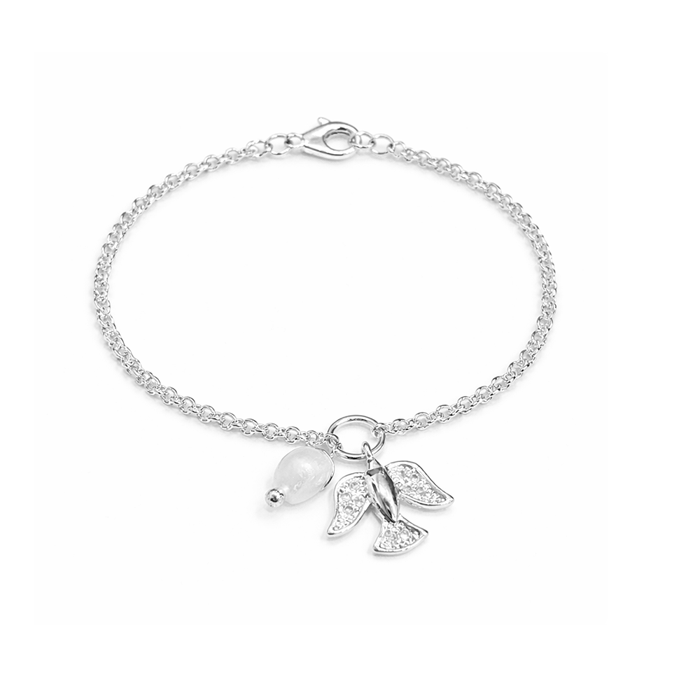 Pulseira com Pingente de Espírito Santo e Pérola no Banho de Ródio Branco