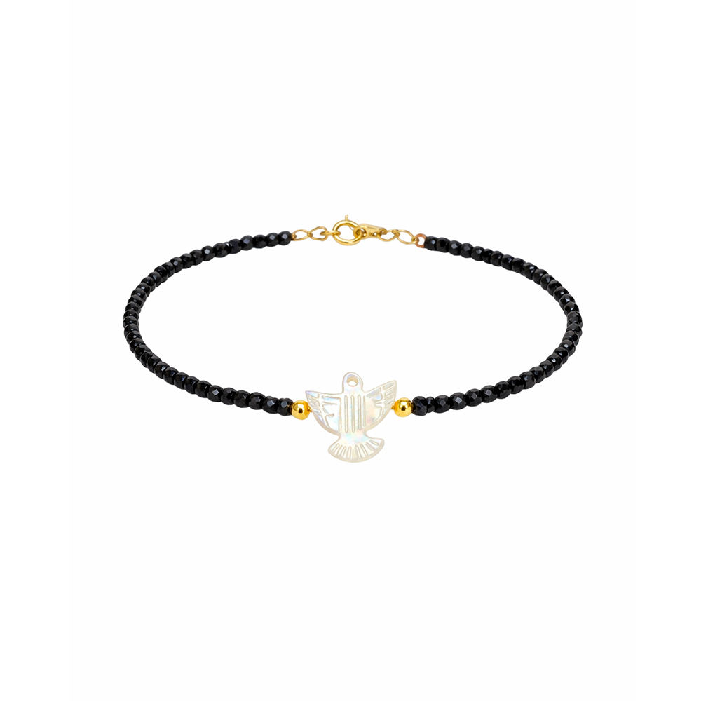 A pulseira é composta por zircônias black, que adicionam um toque moderno e elegante à composição, criando um contraste sofisticado com os detalhes claros da madrepérola. Seu design delicado torna a peça versátil e perfeita para o uso diário.
