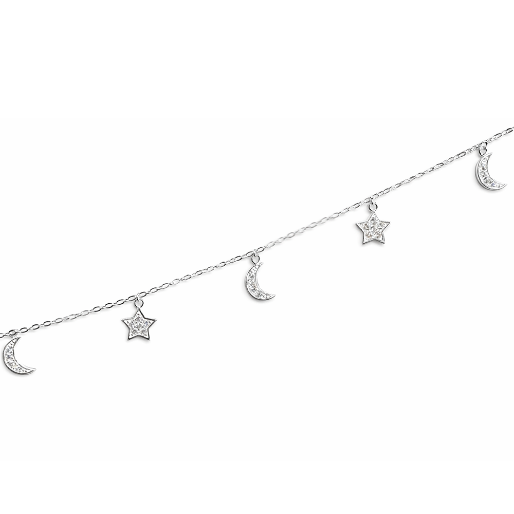 A Pulseira Lua e Estrela em Prata 925 com Zircônias é uma peça delicada e cheia de charme, ideal para quem ama acessórios com significado e brilho suave. Seu design traz pingentes de lua e estrela, cravejados com zircônias, criando um visual leve, feminino e encantador.
