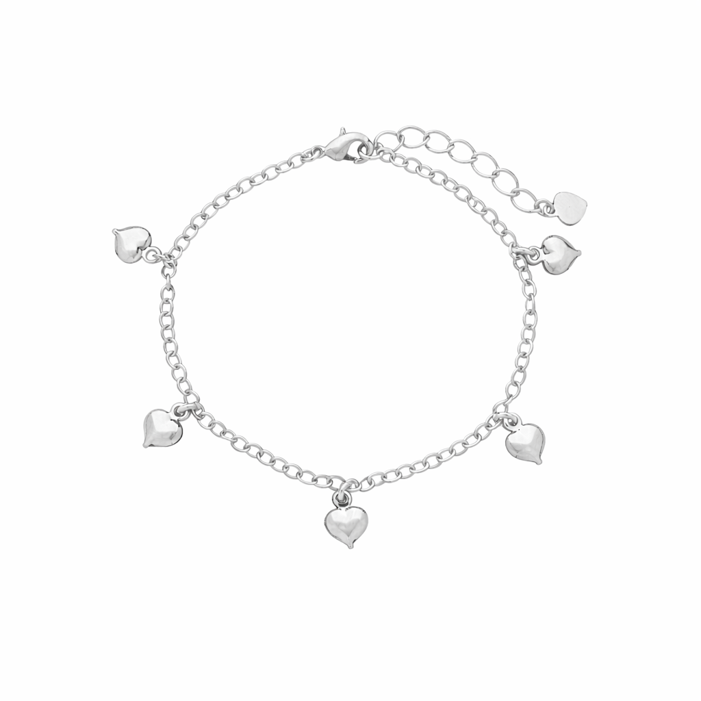 Romântica e cheia de charme, a pulseira com pingentes de coração em banho prateado é a escolha perfeita para quem ama acessórios delicados e cheios de significado. Os pequenos corações distribuídos ao longo da corrente criam um movimento suave e um brilho elegante, valorizando o pulso com leveza.