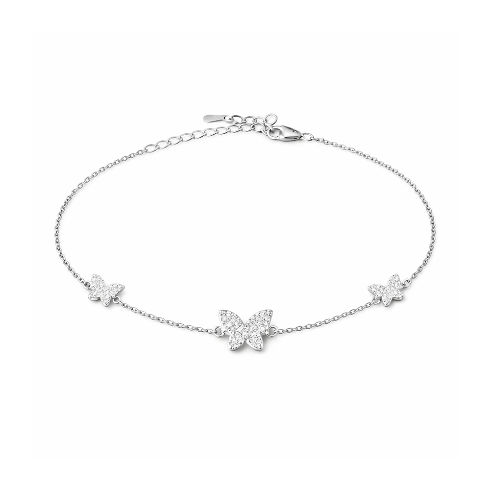 Delicada e cheia de significado, esta pulseira em prata traz um design encantador com borboletas cravejadas em zircônias, que refletem a luz com brilho suave e sofisticado. A borboleta central em tamanho maior se destaca, criando um visual harmonioso e elegante.