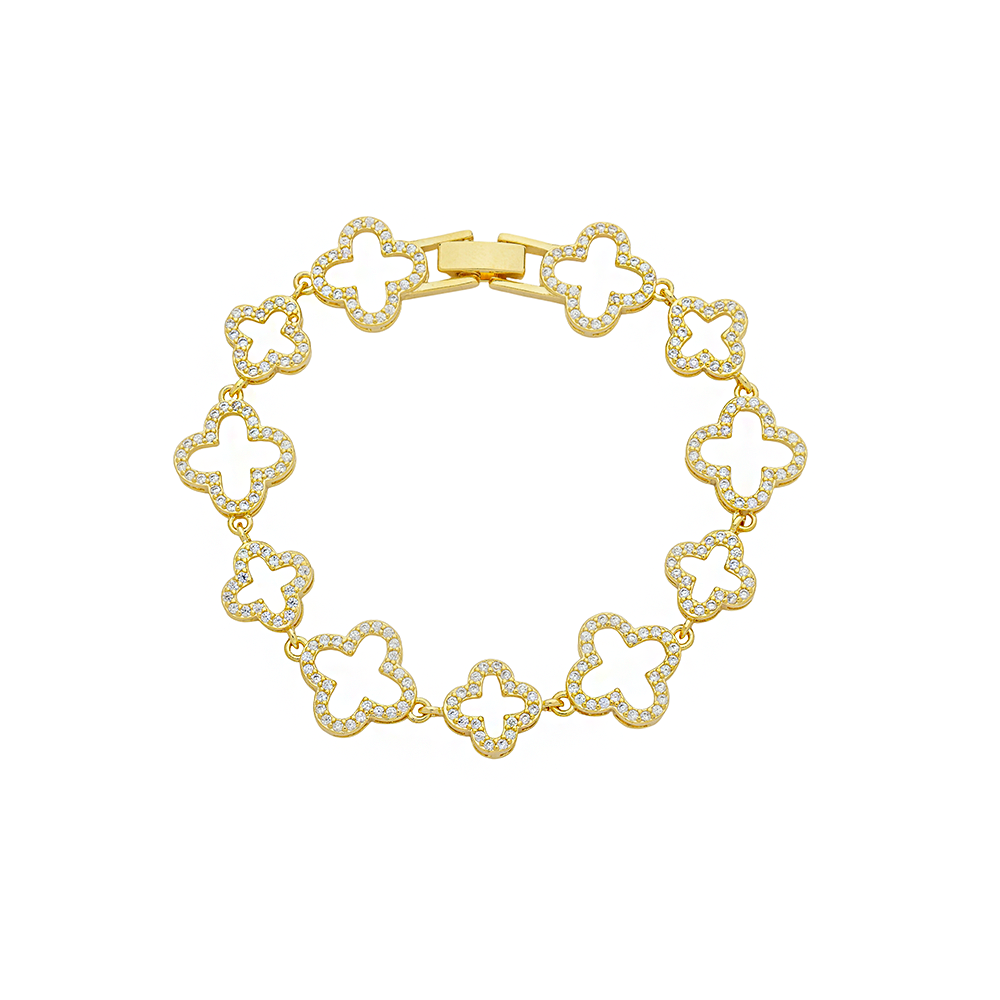 Delicada e sofisticada, a Pulseira Trevo com Zircônias Cravejadas é uma joia que une simbolismo e elegância. Seu design é composto por elos em formato de trevo, símbolo de sorte, proteção e boas energias, todos ornamentados com zircônias brilhantes que iluminam a peça com um toque luxuoso.