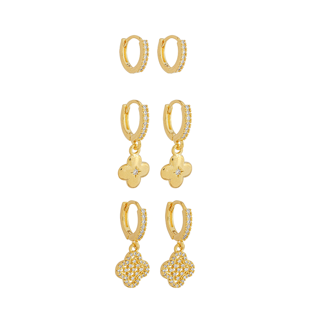 As zircônias incolores garantem luminosidade elegante, enquanto o formato de trevo adiciona um toque moderno e sofisticado à peça. Ideal para uso diário, o kit também é perfeito para compor mix de brincos em segundo ou terceiro furo.